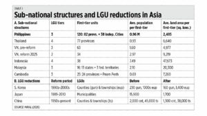 Our three industrialized neighbors have reduced and consolidated their LGUs. Japan cut their municipalities from 15,900 to only 1,700. China cut their counties from 2,000 to 1,300 (see Table 1).