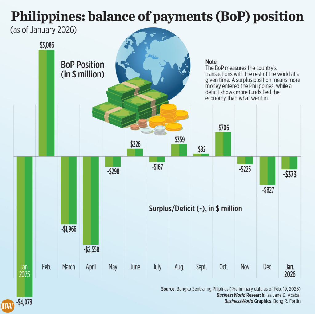 THE PHILIPPINES’ balance of payments (BoP) deficit sharply narrowed to $373 million in the first month of 2026, the Bangko Sentral ng Pilipinas (BSP) reported.